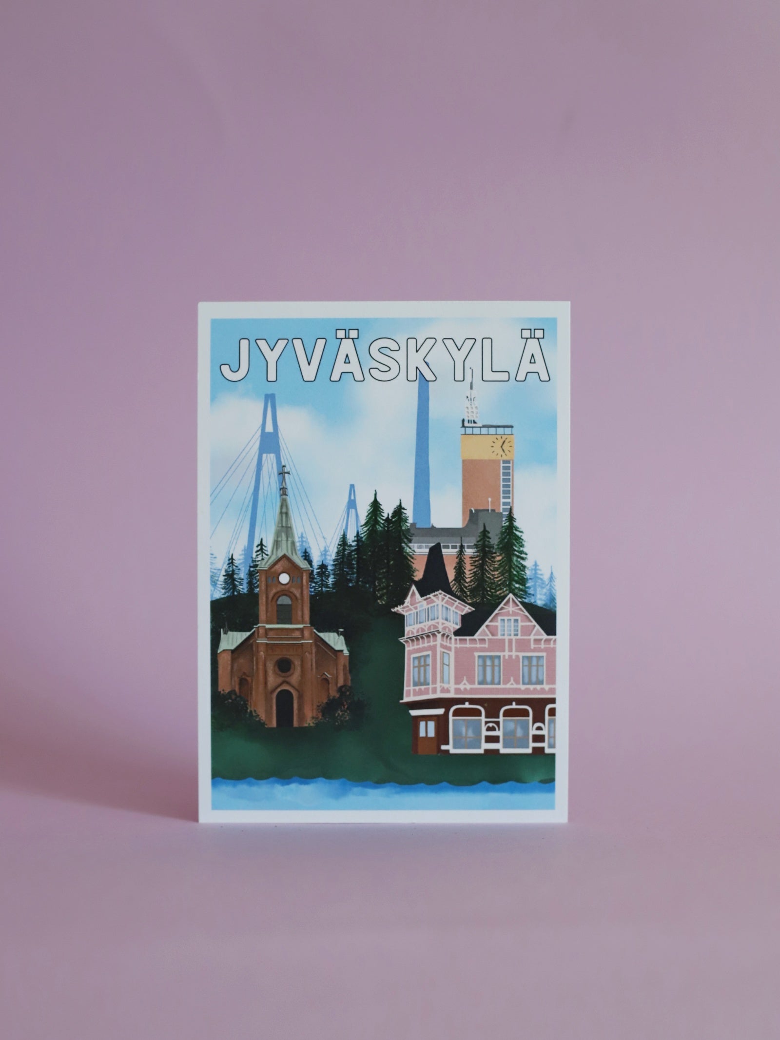 Lämminhenkinen Jyväskylä-postikortti kaupungin tunnetuimmilla maamerkeillä, koko A6 (108 x 148 mm). Kortti on kunnianosoitukseni entistä kotikaupunkiani Jyväskylää kohtaan.