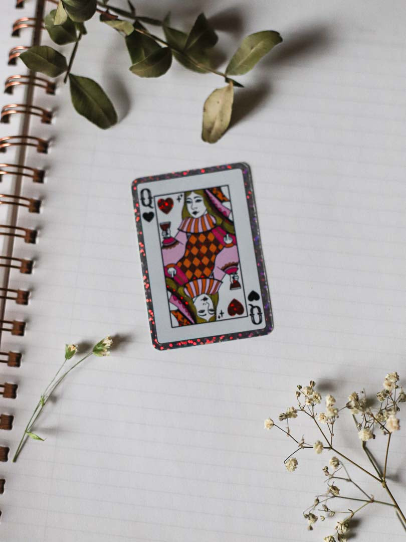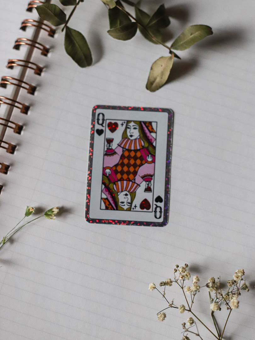 Kuningatar-kortti. Kestää sääoloista riippuen myös ulkokäytössä 2-4 vuotta. Koko 4.9x7.2 cm. Suunniteltu Suomessa, painettu Ruotsissa.